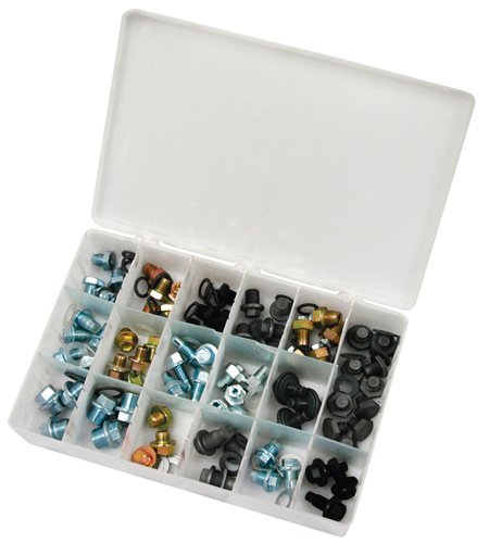 This 76 piece Drain Plug Assortment contains: (5 each) universal 1/2 inch oversize #1, #2 and #3, (5 each) universal 1/2 inch oversize #1 Piggyback and #2 Piggyback, (5) 1/2 inch standard dog point - GM, Chrysler, (5) 12 millimeter x 1.75 GM, (5) 14 millimeter x 1.50 GM, Ford, (10) 1/2 inch Standard - GM, Ford, Chrysler, (3) 18 millimeter x 1.50 Chrysler, Toyota, (3) 20 millimeter x 1.50 Honda, Chrysler, (3) 12 millimeter x 1.75 Saturn, (3) 14 millimeter Dichromate GM, Chrysler, Honda, Mazda, (3) 14 millimeter x 1.50 dog point - Ford, (3) 14 millimeter x 1.25 dog point - Chrysler, Jeep and (3) 12 millimeter x 1.75 GM drain plugs.